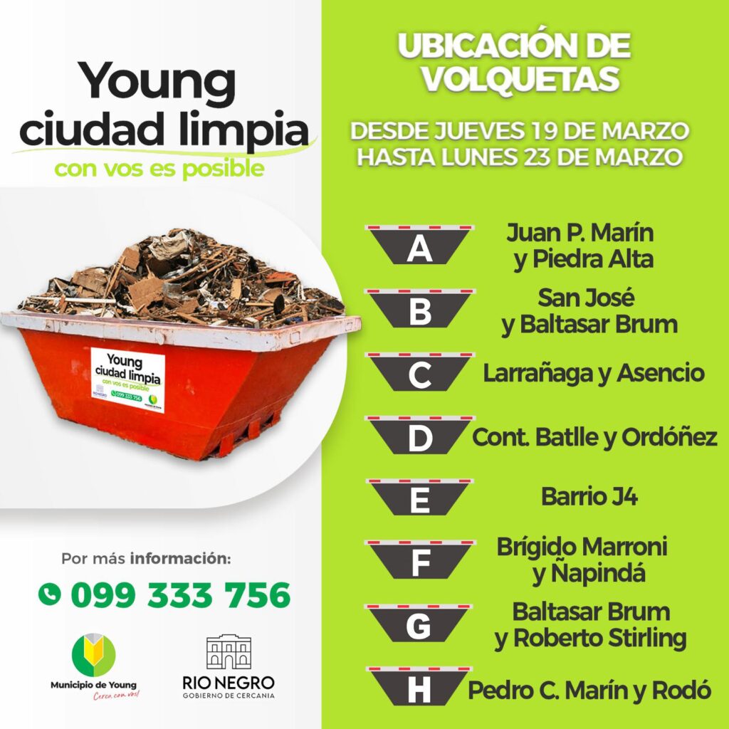 Ubicación de Volquetas en Young. La Intendencia de Río Negro y Municipio de Young informa que se encuentran instaladas nuevas volquetas en diferentes puntos de la ciudad desde el Jueves 19 hasta Lunes 23 de marzo , con el objetivo de mejorar la gestión de residuos y fortalecer la limpieza urbana.