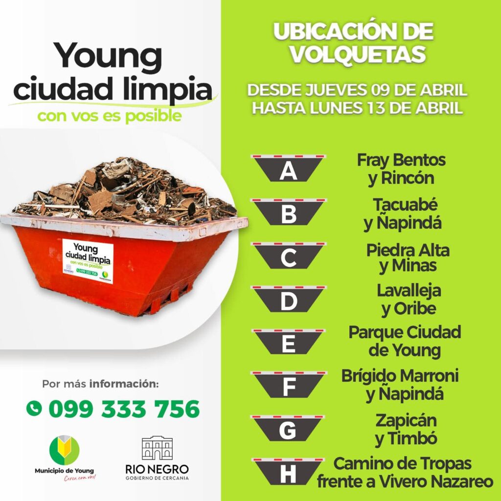 Ubicación de Volquetas en Young. La Intendencia de Río Negro y Municipio de Young informa que se encuentran instaladas nuevas volquetas en diferentes puntos de la ciudad desde el Jueves 09 hasta el Lunes 13 de Abril , con el objetivo de mejorar la gestión de residuos y fortalecer la limpieza urbana. Fuente: Municipio de […]