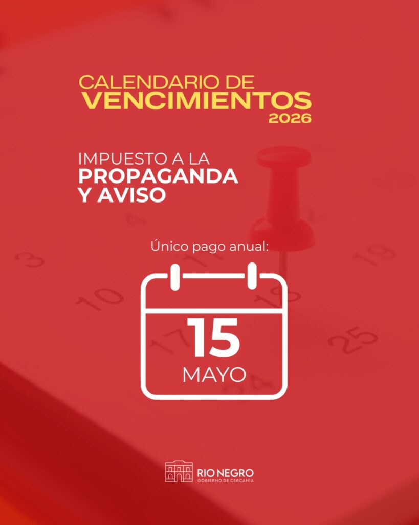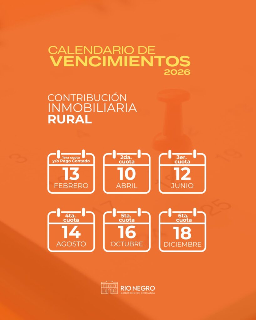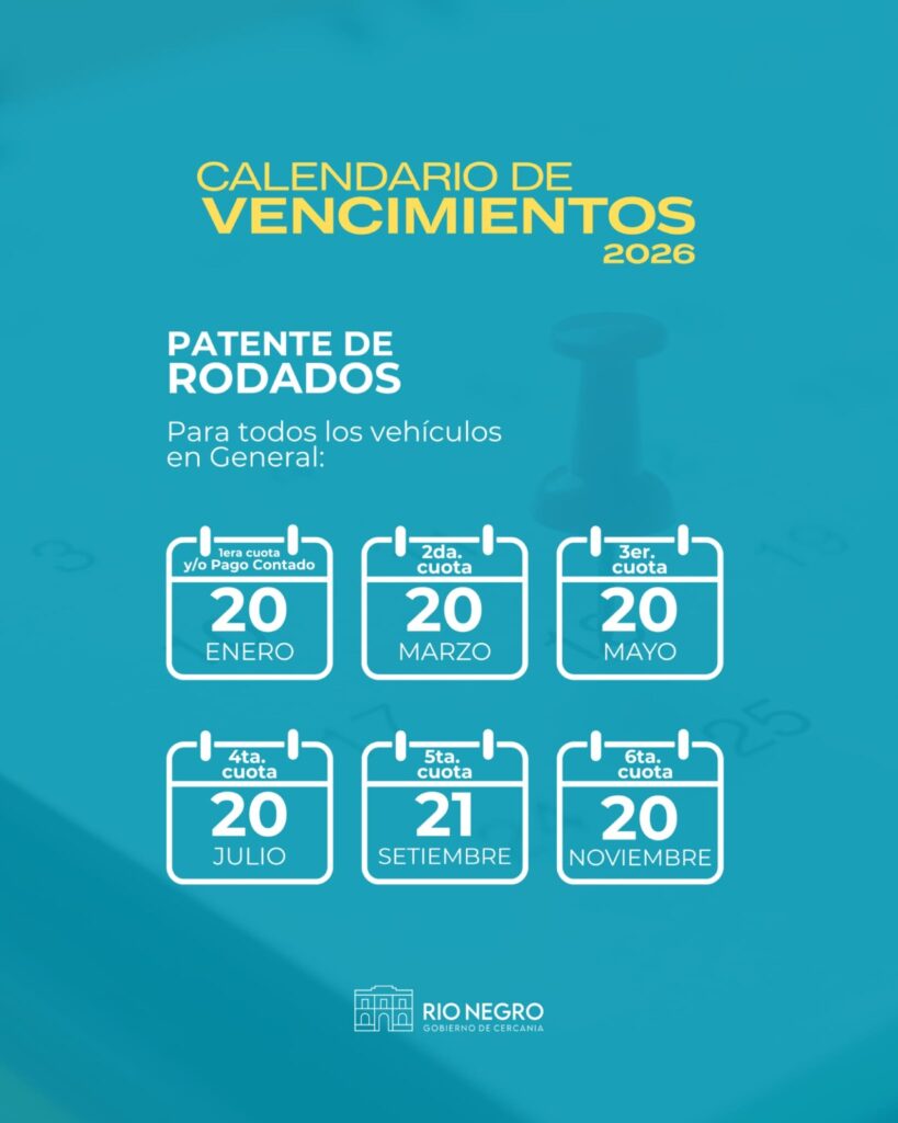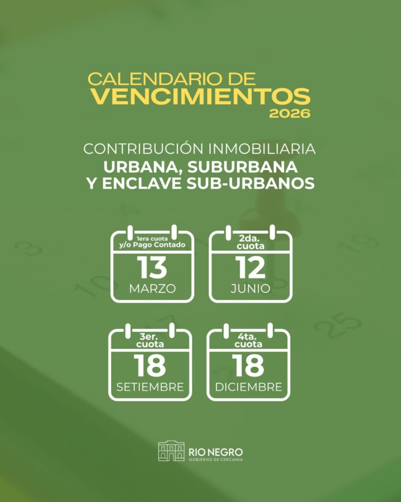 La Intendencia de Río Negro fija calendario de pago de los Impuestos de Patente de Rodados, Contribución Inmobiliaria Urbana, Sub-Urbana y Rural e Impuesto a la Propaganda y Avisos 2026.