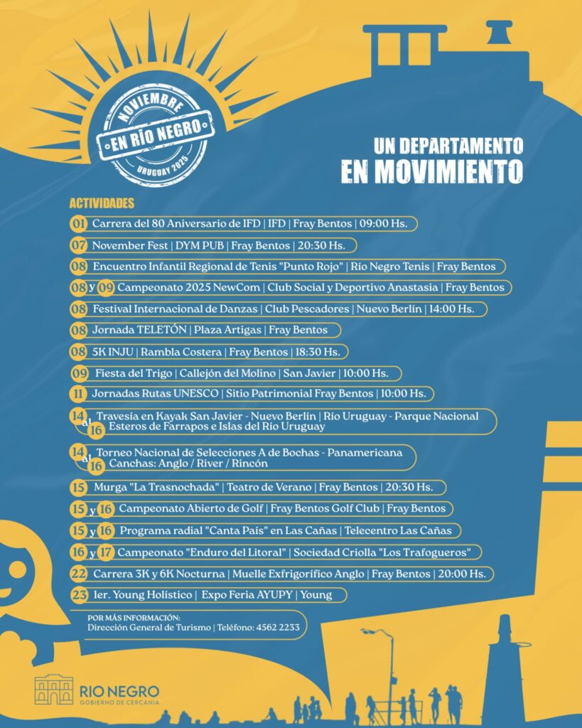 El director de Turismo, Carlos Fagetti, dijo que durante todo el mes, el departamento será escenario de múltiples propuestas, entre ellas el Festival Internacional de Danza en Nuevo Berlín, la Feria del Trigo en San Javier, competencias deportivas como el Campeonato de Kayak que unirá San Javier con Nuevo Berlín, el Torneo Infantil de Tenis, el Regional de Newcom en Fray Bentos y Torneo de Enduro en Young. También habrá espacios para disfrutar de la música, el arte y la cultura popular, como la presentación de murga La Trasnochada, ferias artesanales en la rambla y actividades impulsadas por organizaciones deportivas, culturales y sociales.