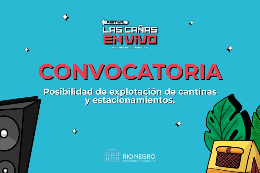 La Intendencia de Rio Negro convoca a instituciones interesadas a postularse para la explotación de los servicios de cantina y estacionamiento (parking) en el marco del Festival Las Cañas en Vivo, a desarrollarse los días viernes 23 y sábado 24 de enero. El presente llamado está dirigido a instituciones, tales como asociaciones civiles, clubes, cooperativas